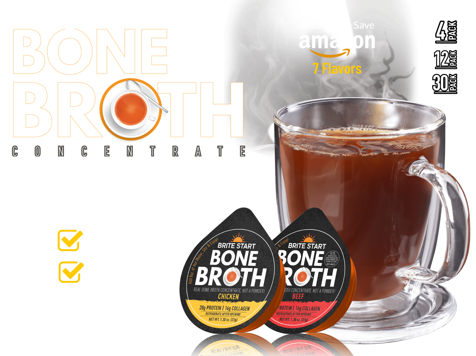 We make our bone broth concentrates from18-hour slow simmered grass-fed beef bones, free-range chicken bones, organic vegetables, herbs& spices. Humanely raised, ethically sourced, No fillers, artificial ingredients or preservatives. No antibiotics, No hormones, Non-GMO.