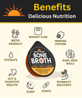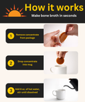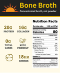 We make our bone broth concentrates from 18-hour slow simmered grass-fed beef bones, free-range chicken bones, organic vegetables, herbs & spices. Humanely raised, ethically sourced, No fillers, artificial ingredients or preservatives. No antibiotics, No hormones, Non-GMO. Packaged in single use container that is perfect for on-the-go or at home. Just add hot water and start sipping.